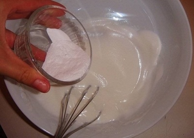 - Продолжаем взбивать еще 3-4 минуты, за это время пена должна стать плотнее и пышнее (но еще не густой и стоячей). Добавляем к ней сахарный песок, который всыпаем тонкой струйкой, также не переставая взбивать. За сахаром сразу же аналогично всыпаем сахарную пудру.