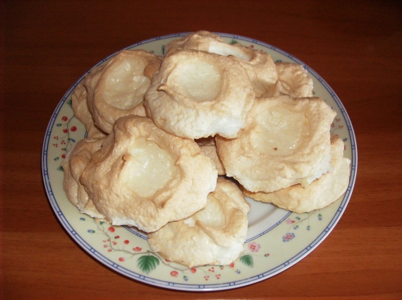 - Застелите противень пергаментом для выпечки и уложите белковую пену на небольшом расстоянии друг от друга, делая в центре каждой заготовки для безе выемку. Если у вас есть специальные приспособления для этого (кондитерский рукав, например), воспользуйтесь ими, так десерт получится и красивей, и аппетитней.