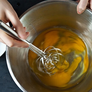 - Взбейте яйца до желтой однородной пенной массы с помощью венчика в течение 3 – 5 минут.