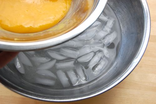 - Когда сливки дойдут до нужной вам консистенции, влейте в отдельную глубокую миску холодную проточную воду и уложите в нее 2 – 3 килограмма льда. Затем поставьте на эту миску емкость с манговым пюре и полностью охладите его, помешивая массу кухонной лопаткой.