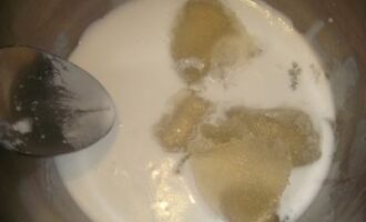 - Остудите молоко до 75-80°C. Затем добавьте в него набухший желатин и 5 гр. ванильного сахара, постоянно помешивая, чтобы избежать образования комков. Оставьте охладиться до 35°C.