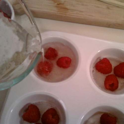 - Затем достав ее, раскладываем в каждую формочку несколько ягод малины, слегка утапливая их в желейную массу. И далее заливаем ягоды оставшейся жидкость. Образовавшуюся пену можно убрать чайной ложкой, чтобы наше желе было более прозрачным.