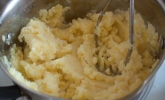 - Осторожно верните картофель в кастрюлю, добавьте кипячёное молоко и активно разомните картофель с помощью толкушки. Добавьте масло и продолжайте разминать до получения ровной однородной массы.