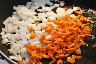 Лук и морковь очистите от кожуры с помощью ножа. Промойте овощи под проточной водой и обсушите бумажными кухонными полотенцами. Затем поочередно уложите на разделочную доску и нарежьте, лук кубиком с примерным диаметром 1 на 1 сантиметр, а морковь брусочками или соломкой с примерной толщиной 0,5 сантиметров и длиной до 3 сантиметров. Разложите овощи по отдельным тарелкам. Включите плиту на среднюю температуру и поставьте на нее сковороду с 2 столовыми ложками растительного масла. В раскаленный жир, закиньте лук и тушите, перемешивая кухонной лопаткой в течение 5 – 6 минут до прозрачности и легкой золотистой корочки. Затем добавьте к луку морковь, тушите овощи вместе еще 6 – 7 минут до полу готовности моркови. После с помощью столовой ложки переложите овощную массу в тарелку. Снимите сковороду с плиты, но не мойте, налейте в нее 2 – 3 столовые ложки растительного масла и на время отставьте в сторону.