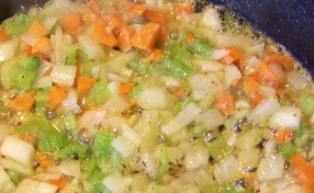 - В сковороду наливаем небольшое количество растительного масла и ставим на средний огонь. Когда емкость с содержимым хорошо разогреется, аккуратно высыпаем в нее измельченный лук, стебли сельдерея и морковь. Убавляем огонь и тушим овощи в течение 10–12 минут. Внимание: время от времени помешиваем компоненты с помощью деревянной лопатки, чтобы они не пригорели. Затем выкладываем в сковороду нашинкованную капусту и мелко рубленный чеснок. Продолжаем готовить все еще в течение 10–15 минут до мягкости.