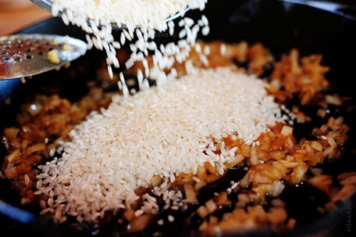 На сковороду, не выключая огонь, добавьте рис. Перемешайте лопаточкой и обжарьте на среднем огне все ингредиенты минуты 2-3.
