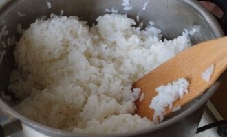 Отвариваем рис. В кастрюлю налейте 200 мл проточной воды, всыпьте туда рис, поставьте на большой огонь до закипания. Когда вода закипела, сделайте минимальный огонь, посолите, перемешайте ложкой, накройте крышкой. Варите в течение 15 минут. До готовности крышку больше не открывайте. Выключите рис, дайте немного настоятся до впитывания воды, не открывая крышки. Рис готов.