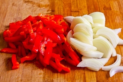 - Рагу у нас будет очень простое, из трех ингредиентов: перец сладкий, лук и грибы. Их подготовка много времени не займет.