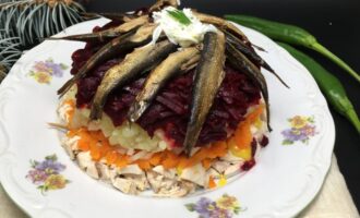 Курица под шубой со шпротами звучит весьма экзотично, неправда ли? Я сперва так же отнеслась к салату с подозрением