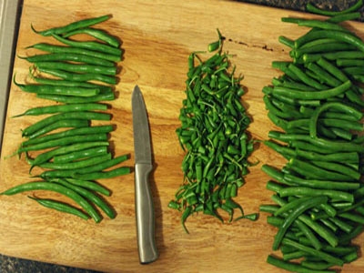- У стручковой фасоли удаляем плодоножки, кладем стручки на разделочную доску, разрезаем их на 2 – 3 равные части и перекладываем нарезку в отдельную глубокую тарелку. Также ставим на кухонный стол оливковое масло, морскую соль и черный молотый перец.