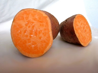 - Теперь берем 1 сладкий клубнеплод, используя кухонный нож, чистим его от кожуры, промываем под холодной проточной водой и кладем его на разделочную доску. Нарезаем картофель кубиками диаметром до 2 сантиметров и закидываем овощ в кипящую воду. Уменьшаем температуру плиты на средний уровень, добавляем в емкость по вкусу немного морской соли и варим сладкий клубнеплод в течение 25 – 30 минут до мягкости.
