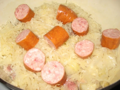 По истечению нужного времени введите к тушащимся ингредиентам отжатую капусту с копченой колбаской и нужное количество мясного бульона. Перемешивать массу на первом этапе тушения ни в коем случае нельзя! Накройте кастрюлю крышкой, прикрутите температуру плиты на самый маленький уровень и тушите блюдо в течение 1 часа. Периодически снимайте крышку с кастрюли и проверяйте уровень жидкости, она должен быть не менее 2 – 3 сантиметров в высоту и частично покрывать мясо, которое тушиться под капустой. Если надо добавьте больше бульона. Старайтесь не вводить много жидкости, так как все ингредиенты довольно сочные, а изюминка этого блюда заключается в том, что они тушатся в собственном соку.