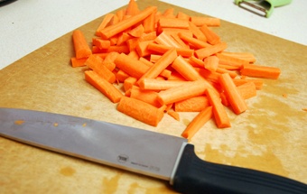 Морковь очищаем ножом от кожуры и после – промываем под проточной водой. После этого выкладываем овощ на разделочную доску и тем же острым инвентарем нарезаем на небольшие прямоугольные кусочки. Измельченную морковку перекладываем в плоскую большую тарелку.
