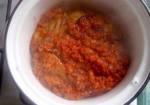 В луково-морковную массу ложкой добавляем томатную пасту. Все это хорошо перемешиваем и тушим заправку до полной готовности. Не забываем перемешивать ее ложкой, чтобы лук с морковью не подгорели. Заправка сделает котлеты мягче, а томат придаст пикантный вкус. И выглядеть такие котлетки будут намного аппетитней.