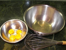 Скорлупу яиц с помощью ножа разбиваем над двумя свободными мисками и отделяем желток от белка. Внимание: чтобы белок лучше взбивался, ставим миску с ним в холодильник.
