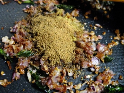 - Репчатый лук необходимо очистить от шелухи и промыть холодной водой, затем измельчить. Потом на раскалённую сковороду добавить 1 столовую ложку оливкового масла и отправить туда, жариться лук примерно на 4 минуты. Лук должен у нас стать прозрачным. Далее добавить к нему 2 чайные ложки получившейся смеси специй, перемешать и подержать полминуты.