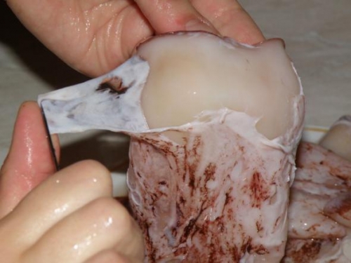 - Очистите кальмары от темной пленки под теплой водой. Снимите слизь и аккуратно вычистите внутренности. Промойте под струей воды.