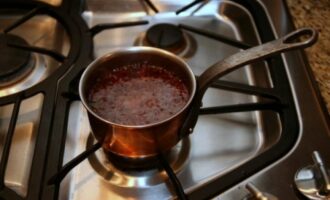 - Для соуса смешайте говяжий бульон, клюкву, лук шалот и вино в кастрюле. Доведите до кипения, затем уменьшите огонь и варите до уменьшения в объёме примерно на две трети.