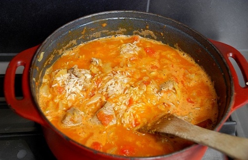 – Как быть, если на дворе мороз и снег и свежих ароматных помидор не достать, а приготовить шавлю очень хочется? Используйте консервированные в собственном соку помидоры, в крайнем случае — томатное пюре.