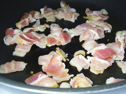 - На следующий день достаем мясо из маринада (который ни в коем случаем нельзя выливать) и перекладываем на бумажное полотенце. Пока оно обсушивается, ставим на средний огонь разогревать сковороду, наливаем немного растительного масла и выкладываем обжариваться бекон, заранее мелко нарезанный. Жарим, постоянно помешивая до тех пор, пока он не приобретёт золотистый оттенок и не пустит весь жир (минуты 3-5). После чего извлекаем его со сковороды при помощи железной лопатки и перекладываем в кастрюлю, в которой собственно и будем готовить говядину по-бургундски. А в сковороду с беконным жиром выкладываем обжариваться куски говядины до образования поджаристого цвета, при этом необходимо периодически его помешивать (минут 5-7).