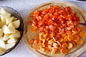 - Затем, воспользовавшись чистым ножом, очищаем от кожуры картофель, чеснок, два вида репчатого лука, морковь, а у сладкого салатного перца удаляем плодоножку и потрошим его от семян. Тщательно промываем все вместе с помидорами, сушим, по очереди отправляем на новую доску и продолжаем подготовку. Картофель измельчаем ломтиками примерного размера в 2–2,5 сантиметра. Сразу скидываем их в миску с холодной водичкой и оставляем там до использования, чтобы не потемнели, а оба вида лука рубим кубиками до 1 сантиметра.