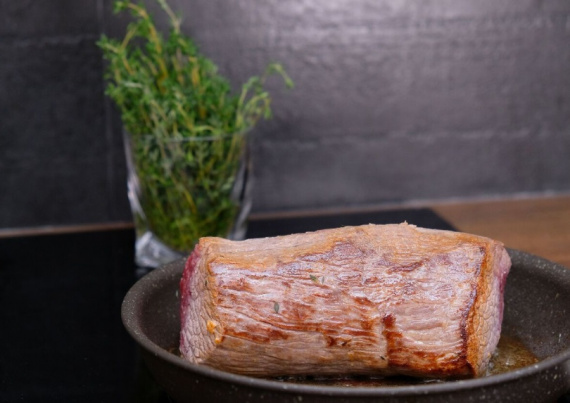 3. Говядину запечатать со всех сторон и с торцов тоже, обжаривая до румяной корочки минуту-полторы с каждой стороны. На этом этапе нам нужно задать корочку и запечатать все соки внутри мяса, внутри оно остается еще сырым и будет доготавливаться в духовке.
