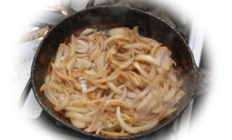 В это время на другой сковороде обжариваем до прозрачности мелко нарезанный репчатый лук.