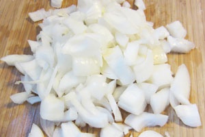 После этого, воспользовавшись новым острым кухонным ножом, очищаем от кожуры репчатый лук, промываем его, сушим бумажными полотенцами, выкладываем на разделочную доску и рубим мелкими кубиками величиной от 5 до 7-и миллиметров.