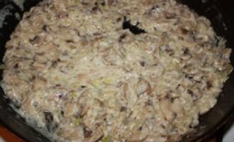 - Добавьте в сковороду сметану, хорошо перемешайте и тушите еще 2 минуты на слабом огне. Затем добавьте муку, тщательно перемешивая, чтобы избежать комочков, и продолжайте готовить на слабом огне до загустения. Посолите и поперчите по вкусу.