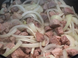 В конце добавляем к мясу полукольца лука, по вкусу солим и перчим, а также хорошо все перемешиваем подручным инвентарем. Слегка увеличиваем огонь и продолжаем жарить блюдо. Внимание: по необходимости можно добавить небольшое количество растительного масла. Когда лук приобретет золотистый оттенок, выключаем конфорку и начинаем сервировать обеденный стол, ведь шашлык уже готов! -