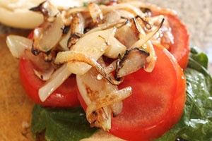 - Тем временем очищаем от шелухи репчатый лук. Промываем его вместе с салатом «Романо» и помидором под струей воды, затем сушим бумажными кухонными полотенцами, по очереди выкладываем овощи на разделочную доску и измельчаем. Томат нарезаем кольцами или полукольцами, лук – соломкой, листья салата разрезаем на 2 половинки, шинкуем крупными кусками или оставляем целыми.