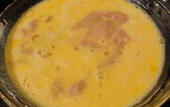 - Тщательно обваляем отбивную в мучном ингредиенте и после этого снова перекладываем в миску с яичной смесью со специями.