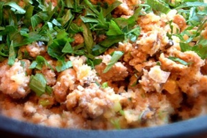 Теперь кладем в миску с жареным луком измельченные каперсы, тимьян, петрушку, свежую цедру лимона, крошки белого хлеба, по вкусу соль, черный молотый перец и одно куриное яйцо. Смешиваем все составляющие начинки столовой ложкой до однородной консистенции и смазываем дно жаростойкого противня 1 столовой ложкой растительного масла.
