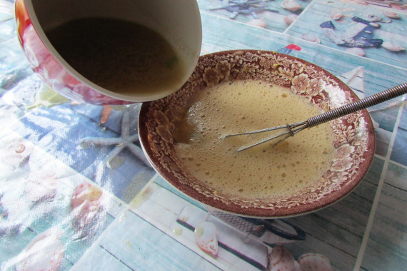 - Перелейте немного горячего мясного бульона из кастрюли с говядиной и тонкой струей влейте его в яичные желтки, не прекращая их взбивать.