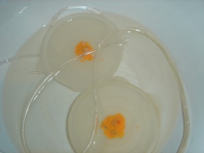 - Остывшее сусло еще раз тщательно перемешиваем стилизованным половником. Берем две обычные пластмассовые крышки, делаем в середине крышек, круглое отверстие при помощи ножа и вставляем в них трубочки от капельниц. Можно одну капельницу разрезать пополам. Выходят трубочки примерно по 40 сантиметров. Вокруг трубочек останутся щели, их можно замазать пластилином. Готовые крышки с трубочками стерилизуем в кипятке.