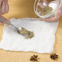 - Берем 1 чайную ложку зеленых сухих семян аниса, 1 чайную ложку семян тмина, 2 звездочки бадьяна и все вмести кладем в тарелку. Семина аниса придадут напитку легкую сладость и крепость. Тмин придаст легкий аромат свойственный только этой специи и желтоватый оттенок. Бадьян даст сильнейший приятный пряный аромат, небольшую горчинку и мощь. Хотя бадьян по вкусу и запаху очень схожий с анисом, но по крепости и долго играющему аромату они разные, бадьян в этом выигрывает, поэтому класть его больше, чем написано в рецепте не рекомендую. Берем чистую стерильную марлю, отрезаем от нее небольшой кусочек, складываем марлю вдвое. Должен получиться квадратик примерно 10 на 10 сантиметров. В середину марлевого квадрата укладываем смешанные в тарелки семена специй.