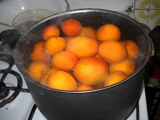 Ставим емкость с плодами на плиту, включенную на сильный уровень, доводим жидкость до кипения, уменьшаем температуру плиты на средний уровень и провариваем абрикосы в течение 5 – 7 минут. Во время варки на поверхности воды будет собираться белая пена, игнорируем ее она сама спадет, просто иногда помешиваем варящиеся абрикосы шумовкой, чтобы вода не выкипала и не заливала плиту.