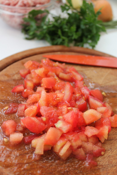 - И нарежьте томаты на мелкие кубики.