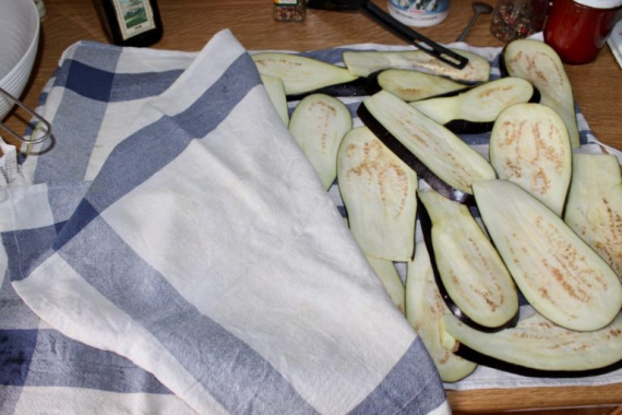 Промойте ломтики баклажан холодной водой, а затем тщательно обсушите их чистым полотенцем.