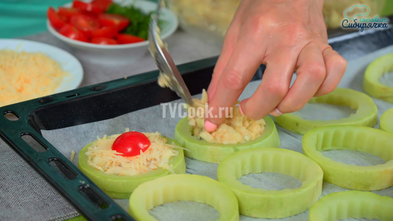 Выкладываем в каждую заготовку из кабачков по 1 ст.л. приготовленной начинки, затем слегка ее уплотняем и выкладываем сверху половинки помидоров черри.