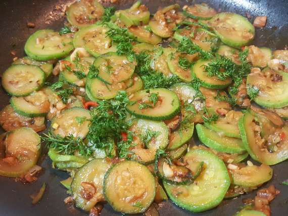Когда цукини станут чуть мягче, добавьте мелко нарезанный чеснок, немного горячей воды и накройте все крышкой, оставив тушиться так на 5 минут.