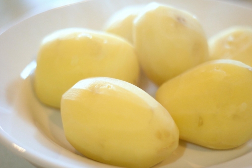 - Теперь немного остывший картофель очищаем от шкурки и с помощью ножа разрезаем на 4 — 6 кусочков произвольной формы, которые удобно будет кушать.