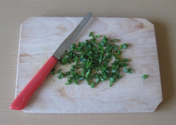 Зеленый лук нарежьте колечками, при этом нам нужна именно зеленая часть.