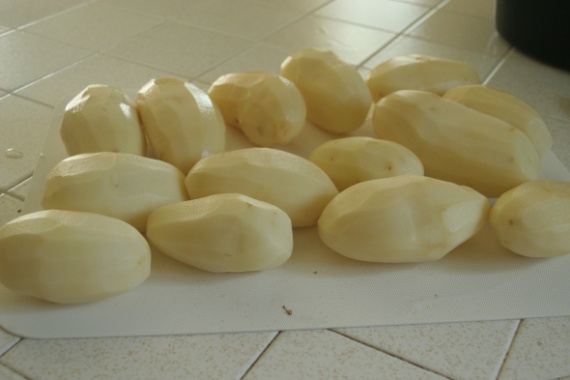 Картофель сложите в раковину и промойте от песка и грязи, после, с помощью ножа для чистки овощей, удалите кожуру, глазки.