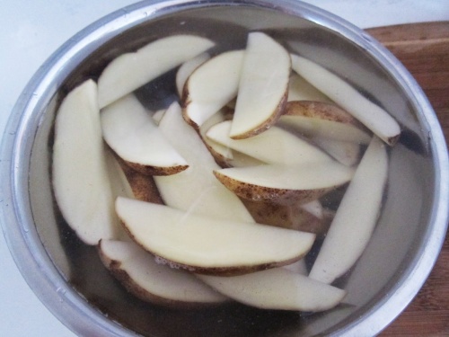 - Теперь выкладываем картофель в глубокую миску, заливаем полностью водой и оставляем на 10 минут. После чего сливаем воду, а дольки насухо вытираем салфетками или бумажными кухонными полотенцами.
