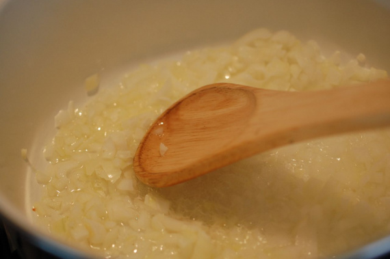 Очистите от шелухи и нарежьте лук маленькими кубиками. Разогрейте в кастрюле с толстым дном растительное масло, а затем бросьте в него лук. Жарьте до прозрачности, но не пережаривайте!