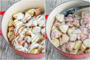 Прямо в ту кастрюлю, в которой вы варили картофель, добавьте натуральный йогурт и осторожно перемешайте. Перемешайте так, чтобы кусочки картофеля покрылись йогуртом со всех сторон.