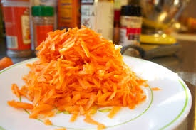 Воспользовавшись овощерезкой, очищаем морковь от кожуры и после тщательно промываем под проточной теплой водой, чтобы удалить остатки земли и другой грязи. Выкладываем овощ на разделочную доску и шинкуем на крупной терке. В конце пересыпаем стружку в свободную маленькую миску и приступаем к приготовлению начинки для перца.