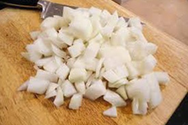 С помощью ножа очищаем лук от шелухи и после тщательно промываем под проточной теплой водой. Выкладываем компонент на разделочную доску и мелко рубим кубиками. Внимание: 2,5 луковицы высыпаем в маленькую миску, а оставшиеся кусочки перемещаем в свободную тарелку и на время оставляем в стороне (они нам пригодятся для зажарки).