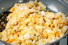 Далее высыпаем сюда морковную стружку и продолжаем готовить начинку. Внимание: по необходимости подливаем в сковороду немного масла и не забываем помешивать все подручным инвентарем, чтобы компоненты не пригорели. Жарим овощи на протяжении 10–15 минут. - В конце добавляем сюда полувареный рис и по вкусу соль. Еще раз все перемешав, выключаем конфорку и слегка охлаждаем начинку.